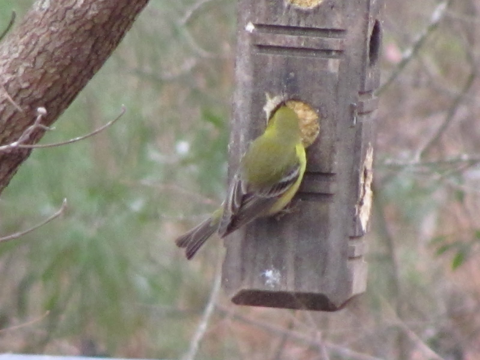 Sitting at the kitchen table enjoying my coffee and looking out the window.Still way to cold to sit outside What!!! is that? Oh my, a Red-bellied Woodpecker is on my log feeder. I had seen one in the spring, HE DIDN'T HANG AROUND LONG ENOUGH TO GET A PIC OF HIM. This one is enjoying my homemade suet. I have watched Downys and Nuthatches a plenty. Oh look at that yellow bird. A Pine Warbler, he was one of my life birds I saw for the first time in Nov. What a wonderful morning,